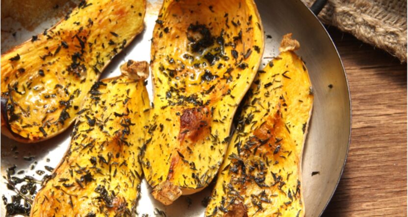 6. Enfournez durant 40/50 minutes jusqu’à ce que votre courge soit bien dorée. (plantez-y un couteau pour vérifier la cuisson, si votre couteau ressort facilement… c’est cuit !).