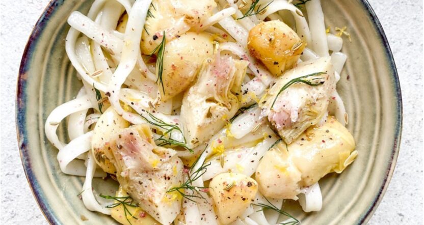 6. Ajoutez l’aneth, l’huile de cuisson de l’ail, vos gousses d’ail, l’artichaut, le sel, le poivre et vos zestes de bergamote.